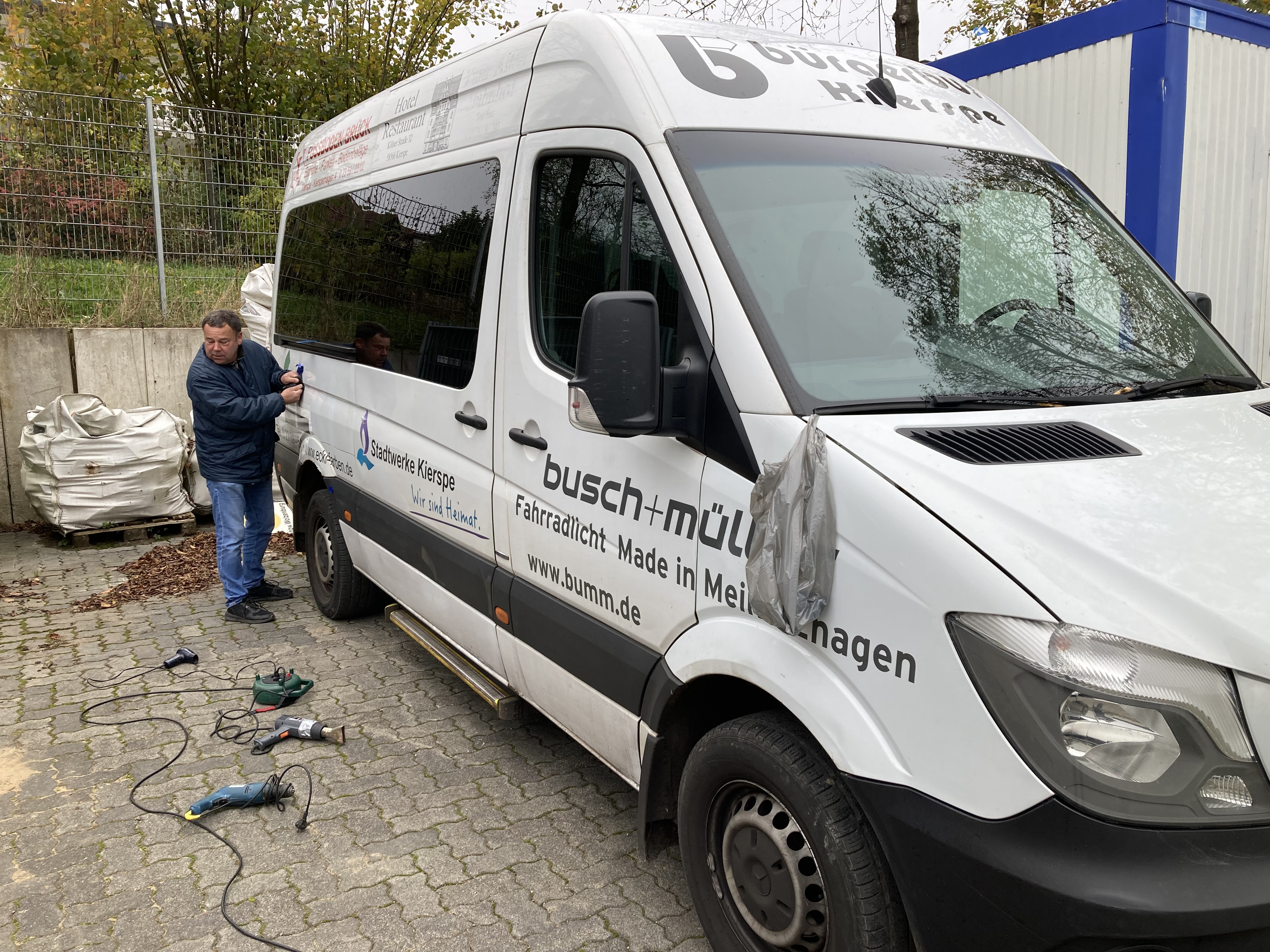 In (fast) jeder freien Minute treffen sich derzeit Bürgerbusfahrer*innen, um den alten Bus von sämtlichen Beschriftungen zu befreien, denn in Kürze soll er geschätzt und vermutlich auf irgendeiner Plattform veräußert werden. Aber das alles ist Sache der MVG, die übrigens nach wie vor nur über die „Notseite“ zu erreichen ist.