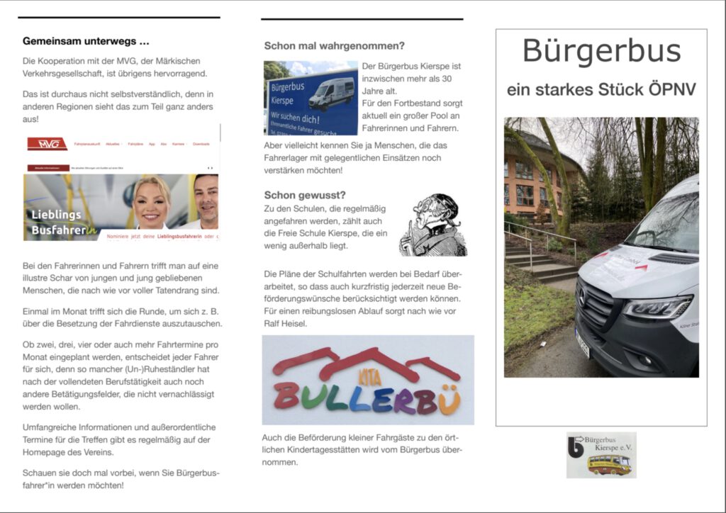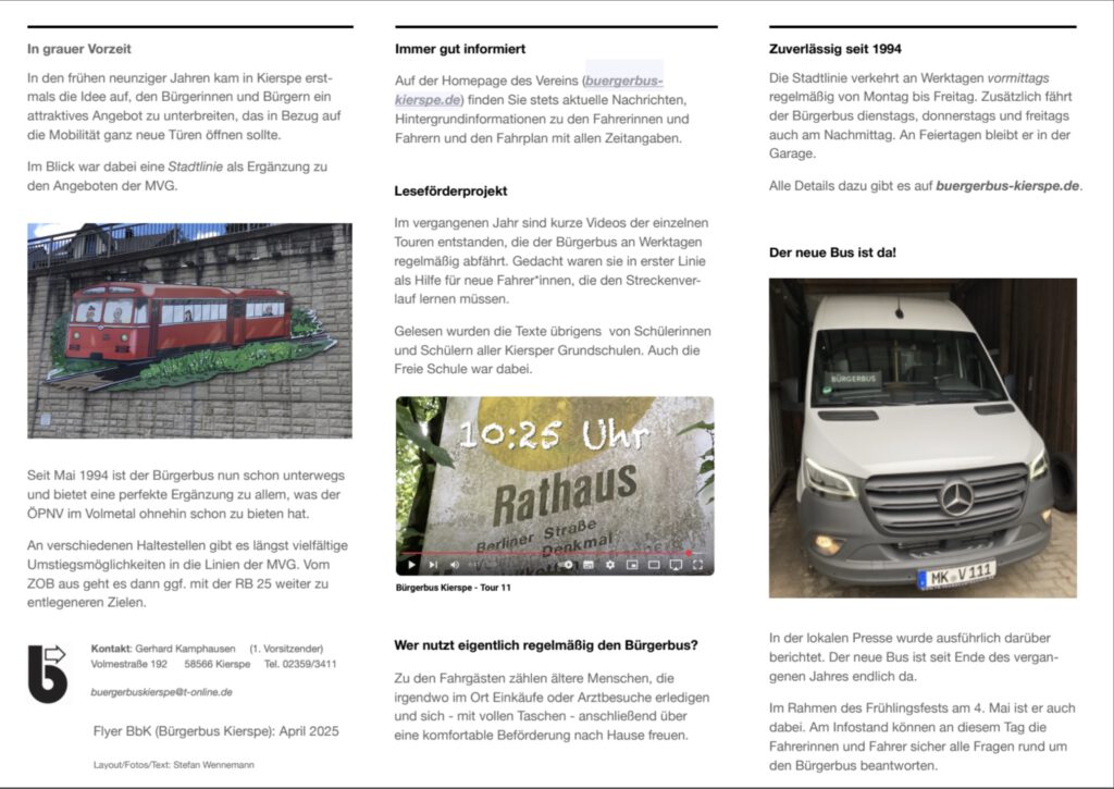 12. April 2025: Von Zeit zu Zeit wird der Flyer des Bürgerbusvereins überarbeitet. Die letzte Version war im September 2023 publiziert worden. Inzwischen ist viel passiert. Der neue Bus ist da und im Fahrerlager tut sich auch immer mal wieder etwas.