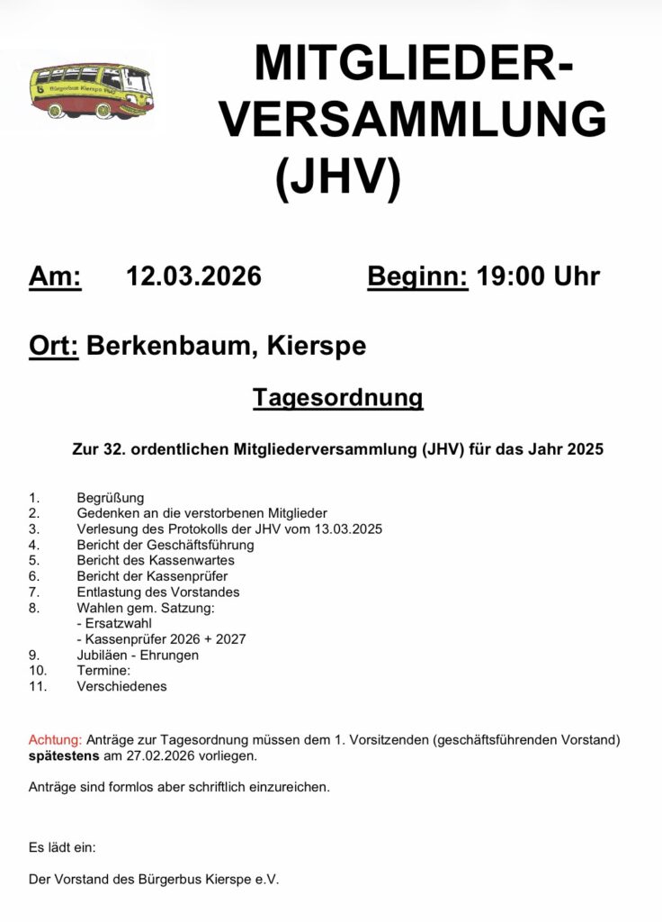 17. Februar 2026: Es ist mal wieder so weit. In Kürze steht die JHV des Bürgerbusvereins an. Alle Details dazu finden sich – wie immer – in der Einladung. Eingeladen sind neben den Fahrerinnen und Fahrern alle Mitglieder des Vereins.
