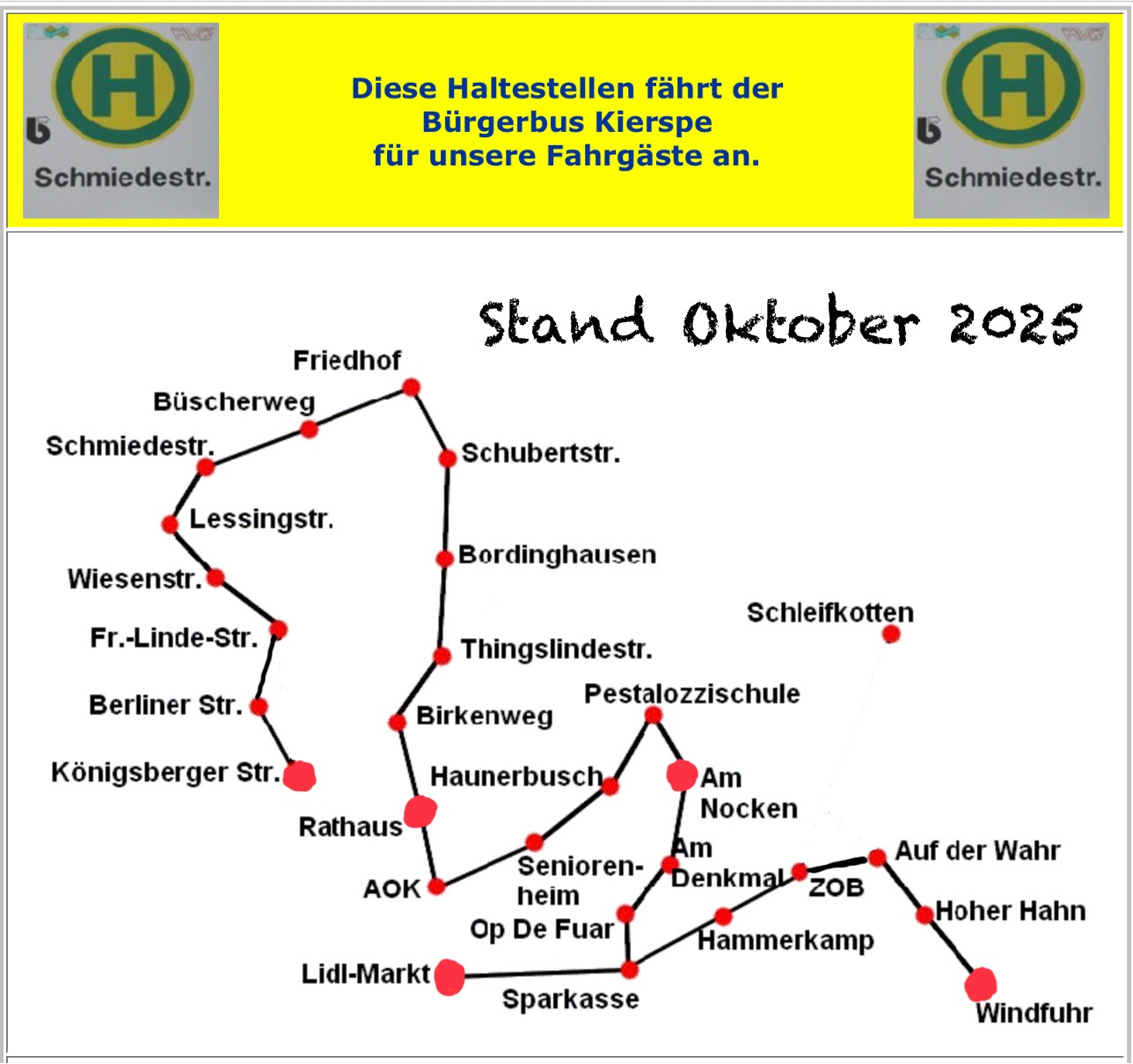 Der Bürgerbus Kierspe fährt montags bis freitags jeweils vormittags, und zwar als Tour 1 während der Schulferien und als Tour 11/Tour 12 an Schultagen.