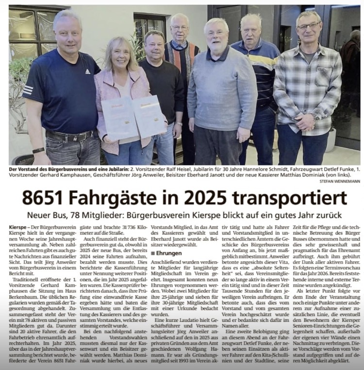 25. März 2026: Der Bürgerbus in Kierspe läuft und läuft seit mehr als dreißig Jahren ziemlich erfolgreich, Fast 9000 Fahrgäste wurden im Jahr 2025 befördert.